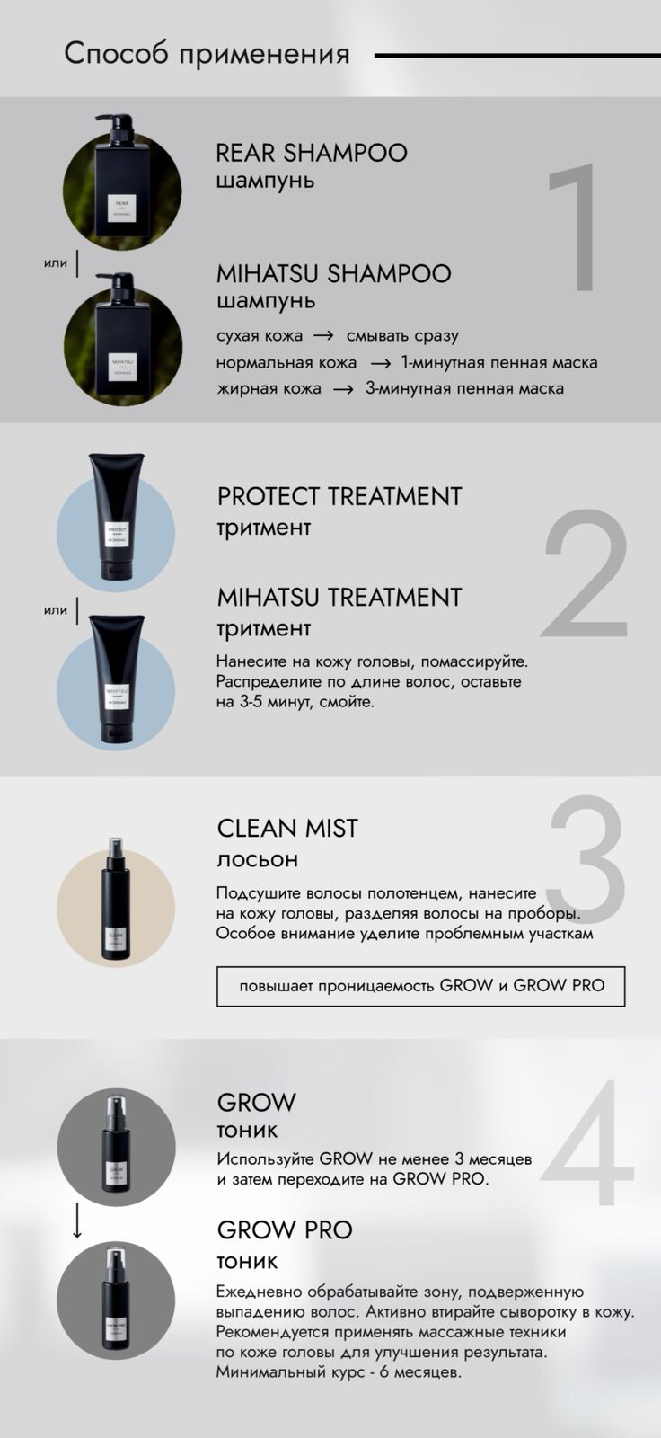 Маска-тритмент наносится на кожу головы и распределяется по длине волос. Восстанавливает естественный уровень увлажнённости, устраняет чувство сухости и стянутости. Является важным этапом в подготовке к применению активаторов роста (GROW и GROW PRO). Придаёт волосам объём, предотвращает ломкость, защищает при термическом воздействии. Антистатики помогают волосам меньше «электризоваться». Молочная кислота способствует увлажнению, делая волосы гладкими и послушными. Аскорбиновая кислота стимулирует выработку коллагена, улучшает рост и качество волос.